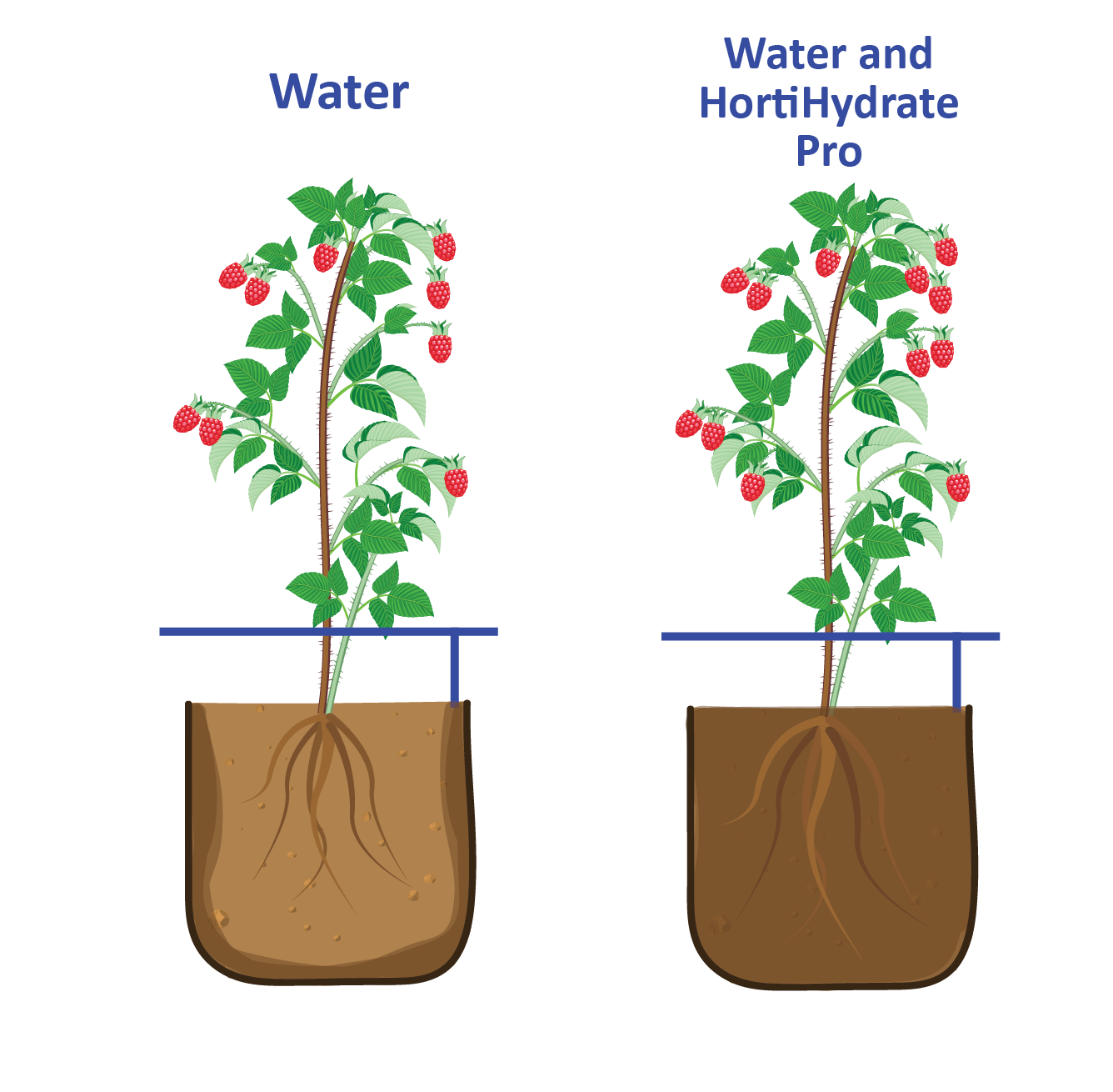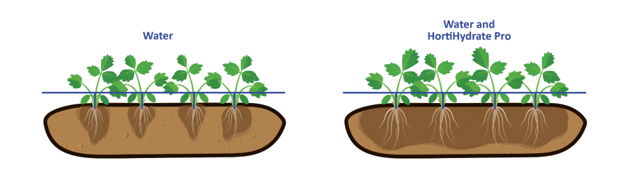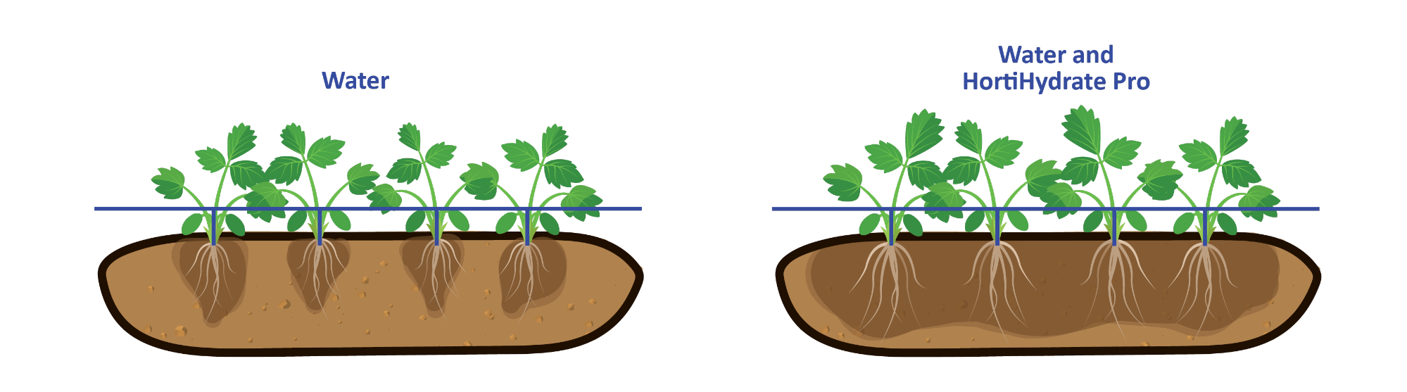All types of growing media can become hydrophobic when dry, making it much more difficult to re-wet leading to unevenly watered areas, reducing crop growth rate and quality. HortiHydrate Pro also contains spreading and penetrating surfactants to alleviate this problem quickly, making the most of all the water and nutrients supplied.